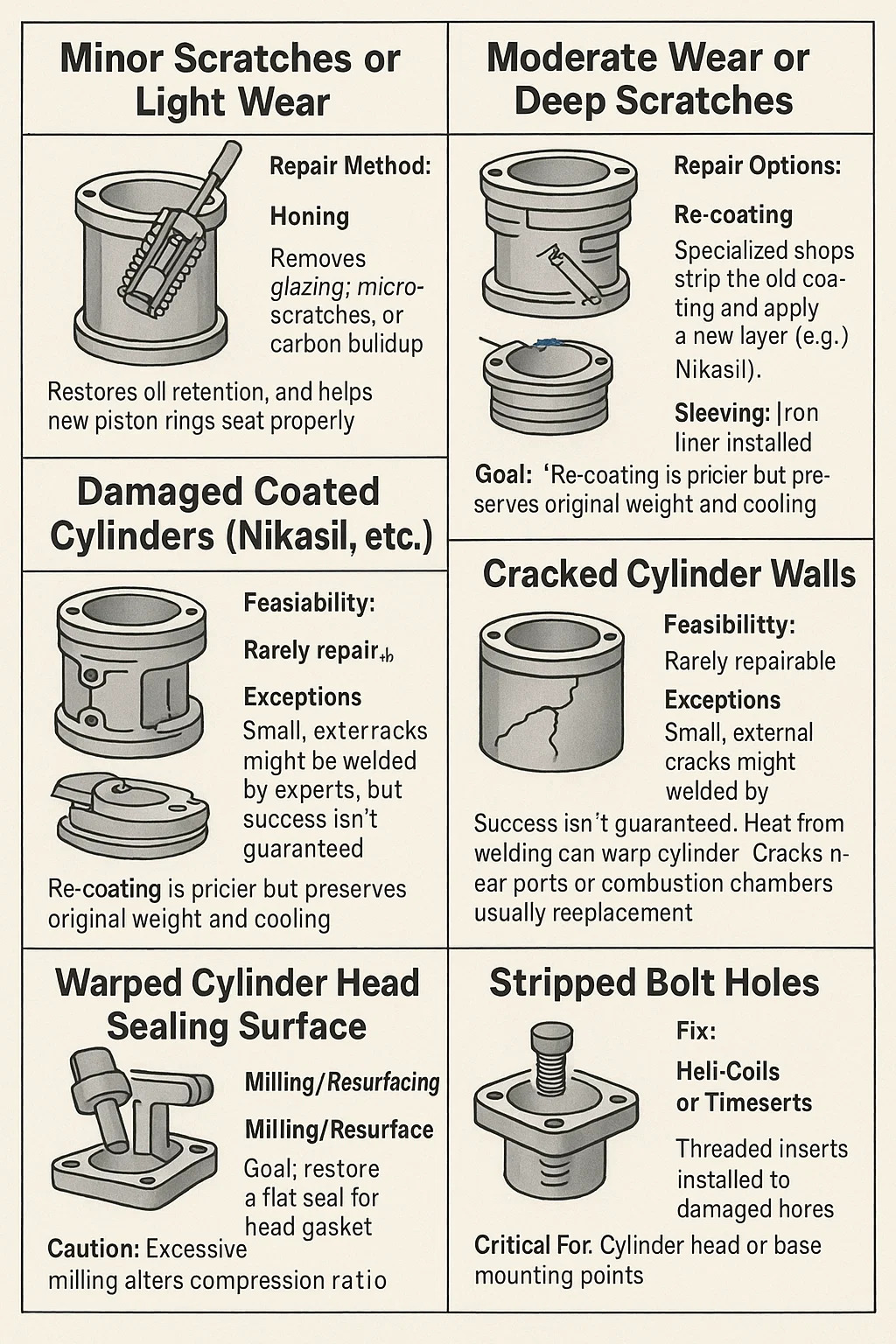 전적으로, 오토바이 실린더 손상 유형과 심각도에 따라 수리가 가능한 경우가 많습니다. 실제 분석은 다음과 같습니다.