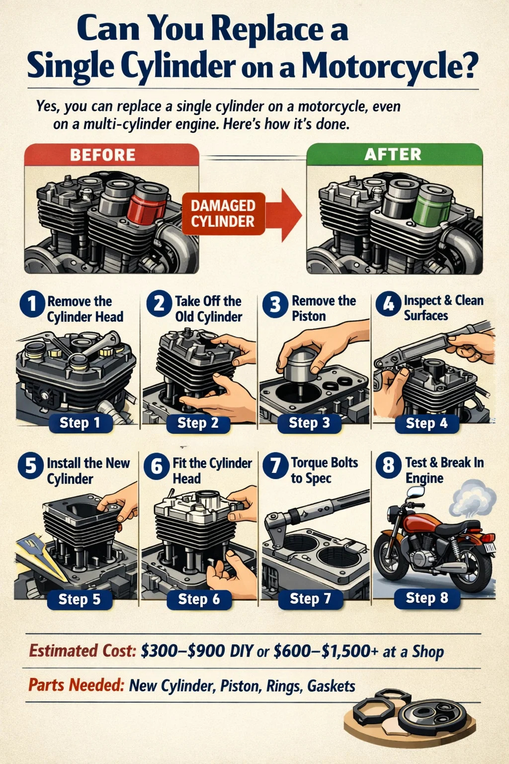 비용은 실린더 유형, 오토바이 제조업체 및 모델, OEM 또는 애프터마켓 부품 사용 여부, 작업이 DIY 또는 상점에서 수행되는지 여부에 따라 크게 다릅니다. 아래 표에는 가장 일반적인 시나리오에 대한 현실적인 비용 범위가 나와 있습니다.