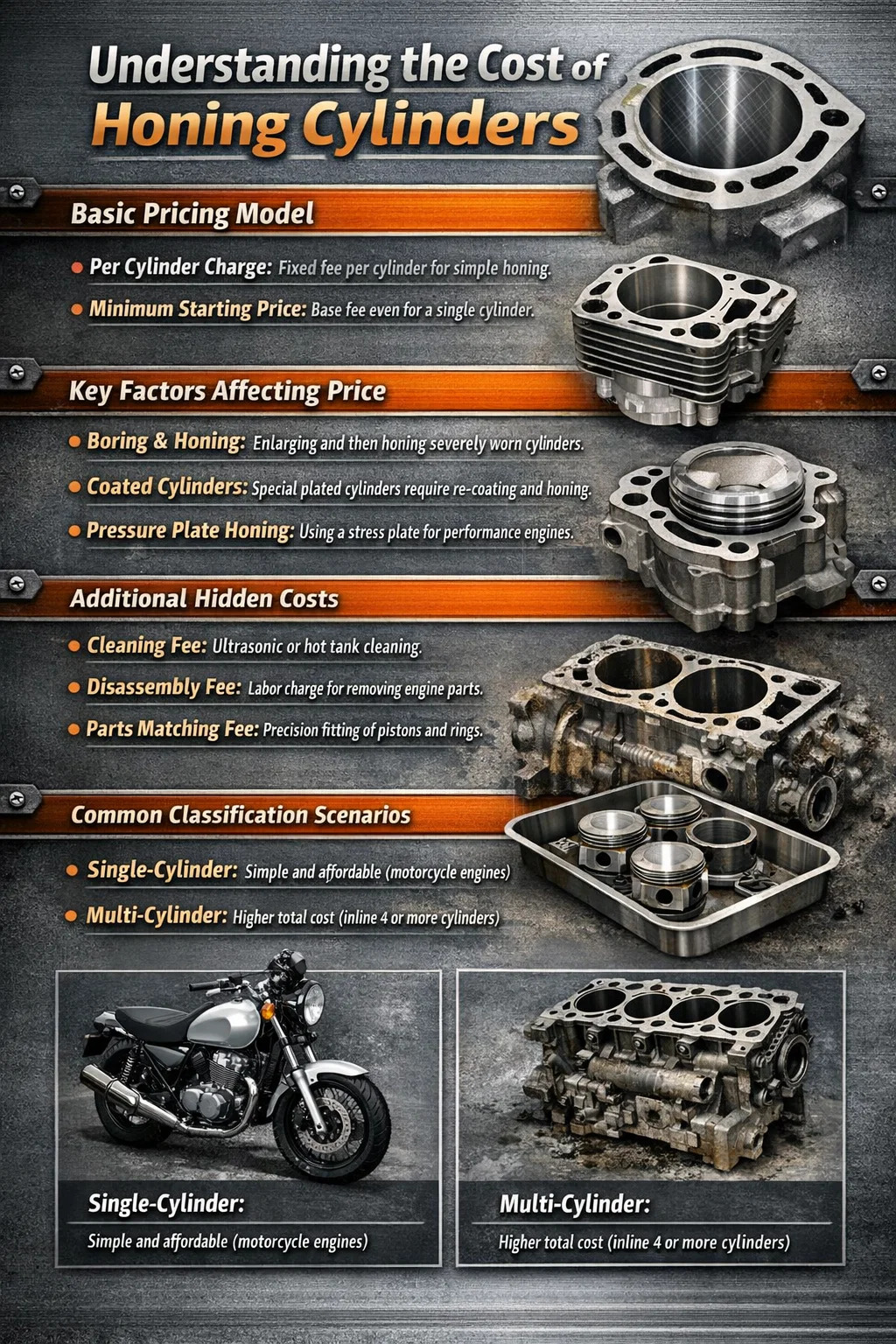 최소 요금 또는 시작 가격: 하나만 있어도 오토바이 실린더 처리하려면 많은 상점에서 최소 시작 가격을 정해야 합니다. 기계를 세팅하고 부품을 고정하는 데도 상당한 시간이 걸리기 때문이다.