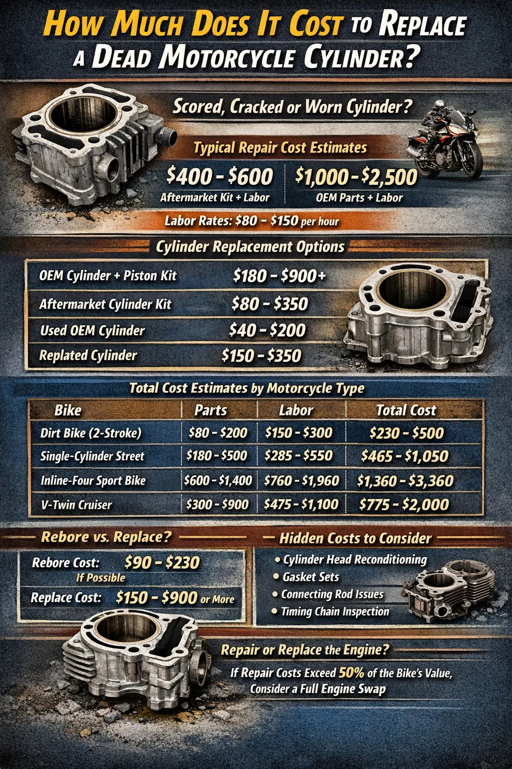 오토바이 실린더가 사양 이상으로 눌리거나, 금이 가거나, 마모된 경우 일반적으로 수리 비용은 다음과 같습니다. $300 ~ $1,500 이상 , 엔진 유형, 교체 실린더 또는 실린더 키트 비용, 매장의 인건비에 따라 달라집니다. 소형 단일 실린더 통근용 자전거의 경우 예산 친화적인 애프터마켓 실린더 키트의 가격은 부품 비용만 $80~$150에 불과합니다. 배기량이 높은 2기통 또는 4기통 스포츠 자전거의 OEM 실린더 부품은 정비사가 렌치를 집어들기 전에 600달러에서 900달러를 넘을 수 있습니다. 일반적으로 시간당 80~150달러에 달하는 인건비와 4~8시간이 걸리는 작업을 추가하면 총 비용이 빠르게 증가합니다.