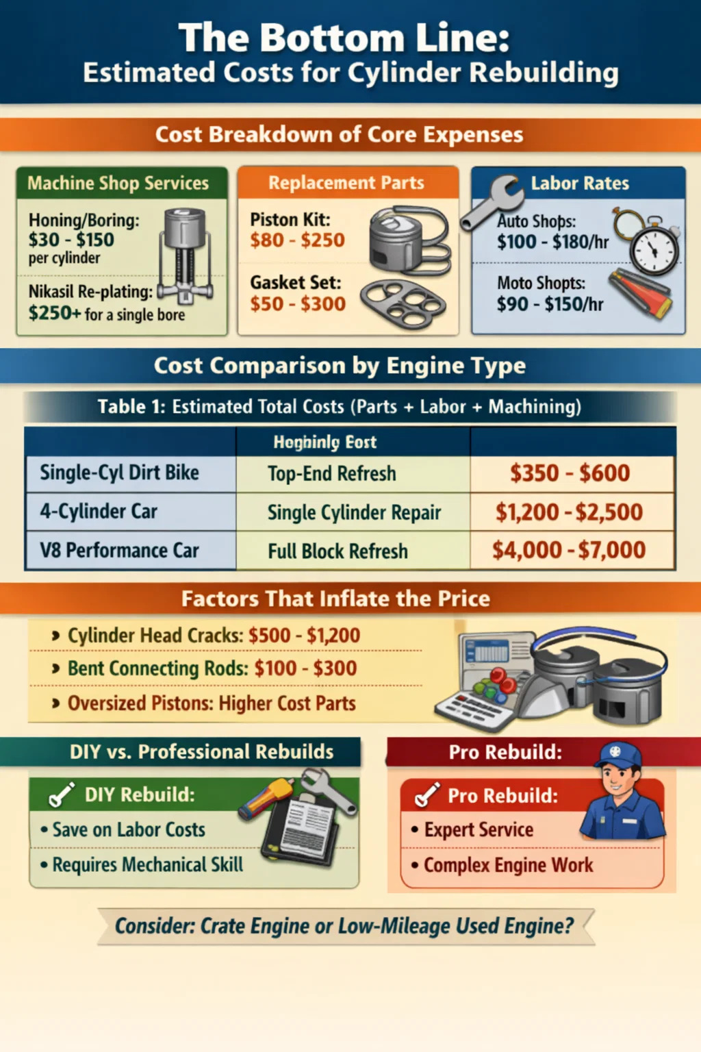 실린더 재구축은 단일 거래가 아니라 부품, 전문 가공 서비스 및 집중적인 노동력의 조합입니다. 돈이 어디로 가는지 이해하려면 엔진 블록과 피스톤 어셈블리의 특정 요구 사항을 살펴봐야 합니다.