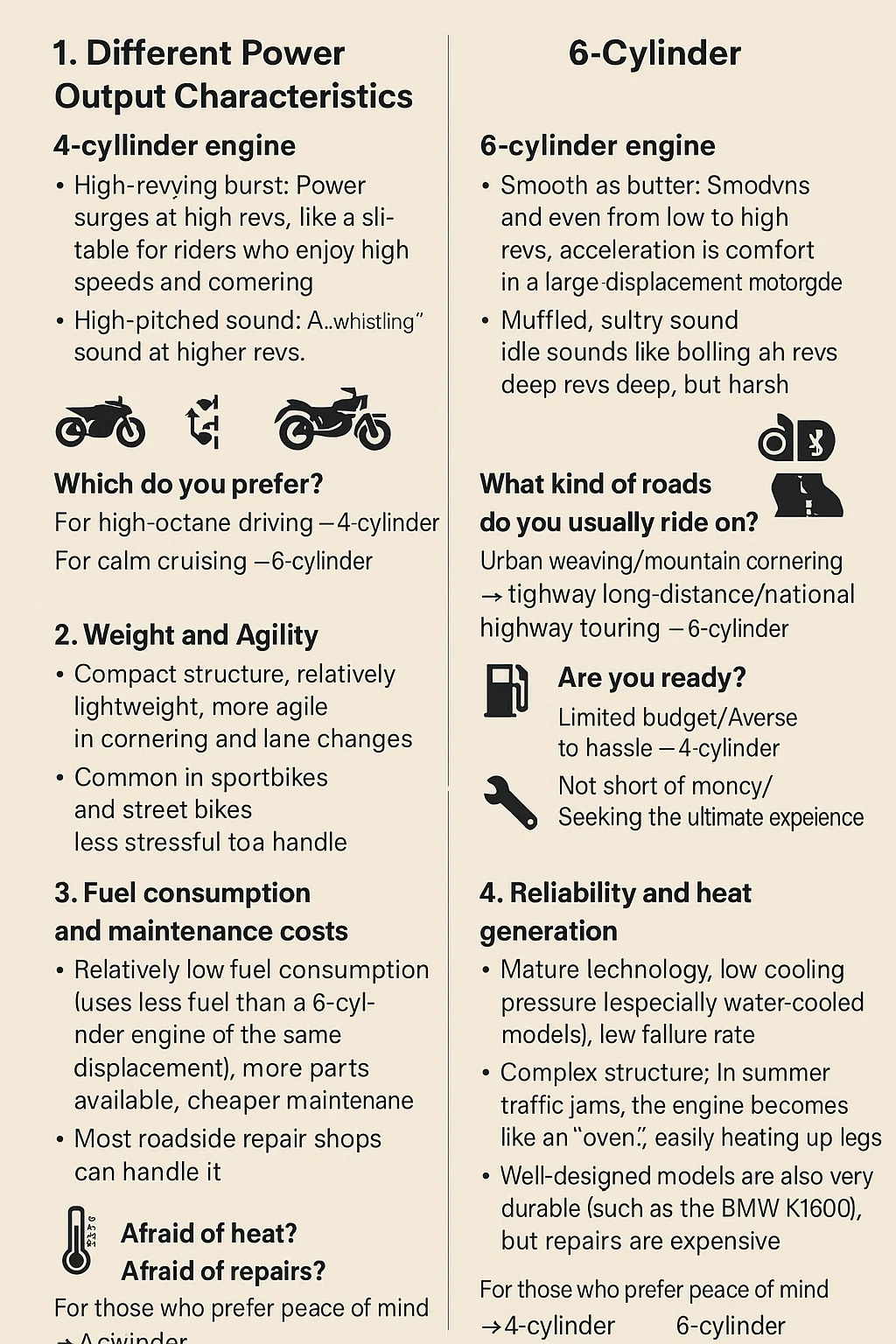 오토바이용 4기통 엔진과 6기통 엔진 중에서 선택하는 것은 선호하는 용도와 스타일에 따라 다릅니다. 비교는 다음과 같습니다.