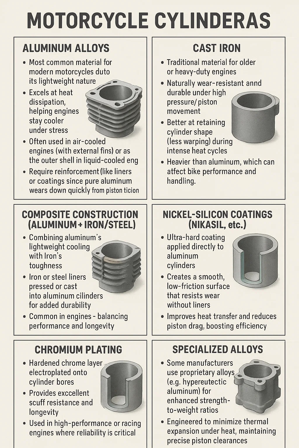 오토바이 실린더 주로 강도, 내열성 및 내구성을 위해 선택된 금속으로 만들어집니다. 일반적인 재료와 그 특성에 대한 자세한 분석은 다음과 같습니다.